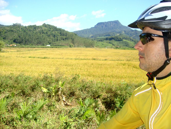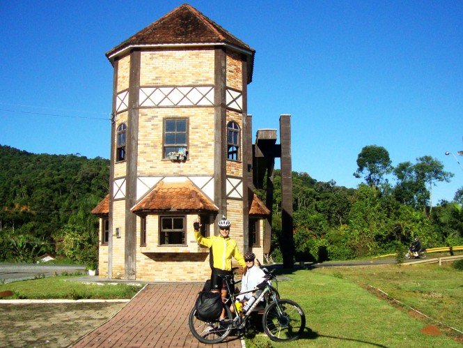 Chegamos então a Luiz Alves. Cidade pequenina e encantadora. Nós que adoramos cidades pequenas nos sentimos em casa. Só tem um hotel na cidade, e como era domingo a maioria dos lugares estavam fechados. Ali encontramos o cicloturista que havia passado por nós quando estávamos almoçando. Um carioca chamado Leo, que veio do Rio de Janeiro especialmente para fazer este circuito. A partir deste momento nossa aventura ganhou mais um integrante. Passamos a fazer o percurso juntos.