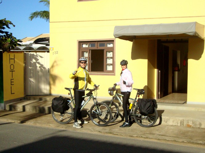 Ficamos hospedados em Bombinhas, em um hotel com ótima estrutura. Nos acomodaram em um quarto espaçoso, com sala e cozinha para as magrelas ficarem. Jantar no apartamento e que bela janta... apropriada para quem pedalou o dia todo. E aquele café da manhã. Dava tranquilamente para 4 pessoas comerem. Mas nós demos um jeito, preparamos lanches para comer na estrada, pois o dia mais pesado do circuito nos esperava.