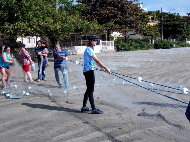 O quarto dia foi sem dúvidas o dia mais bonito de todo o circuito. Vivenciamos intensamente todo este trecho. Para quem fará este circuito futuramente, nossa sugestão seria de separar dois dias para pedalar pela península de Porto Belo. Tivemos um final de tarde perfeito, com direito a pesca da tainha, barquinhos e pescadores, molhar o pé na água gelada, sentar e ouvir o bater das ondas, caminhar, escutar e ver o balé aéreo das gaivotas e neste momento o amigo choro compareceu, e foi lindo. Não tinha como não se emocionar.