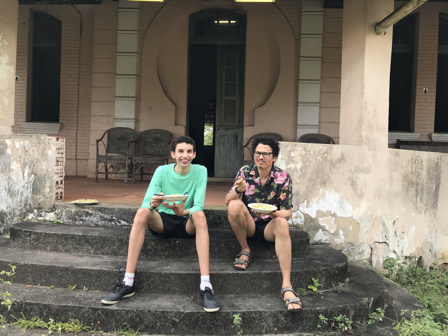 Hora do rango, na escadaria da casa principal. (Foto de Issac)