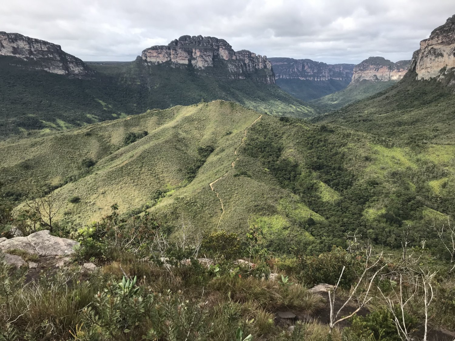 A trilha para o Cachoeirão por Cima era uma planície super agradável com alguns trechos meio confusos, a exemplo do local conhecido como Toca do Gavião. Há alguns lajedões onde a trilha desaparece. Tivemos certa dificuldade para nos guiar, mesmo com o Maps.me. Ao chegamos ao sensacional mirante na parte alta da cachoeira, contemplamos a vasta região do Pati de Baixo. Nosso despedida do vale estava em processo.