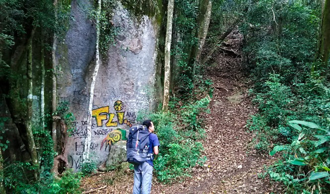 A travessia se iniciou pela Trilha da Pedra do Sapo, por volta das 13hs, em meio a vegetação secundária de mata atlântica em estágio médio de regeneração, bem demarcada, sombreada, com algumas bifurcações e acentuado aclive. Aproveite para abastecimento de água nesta trilha!