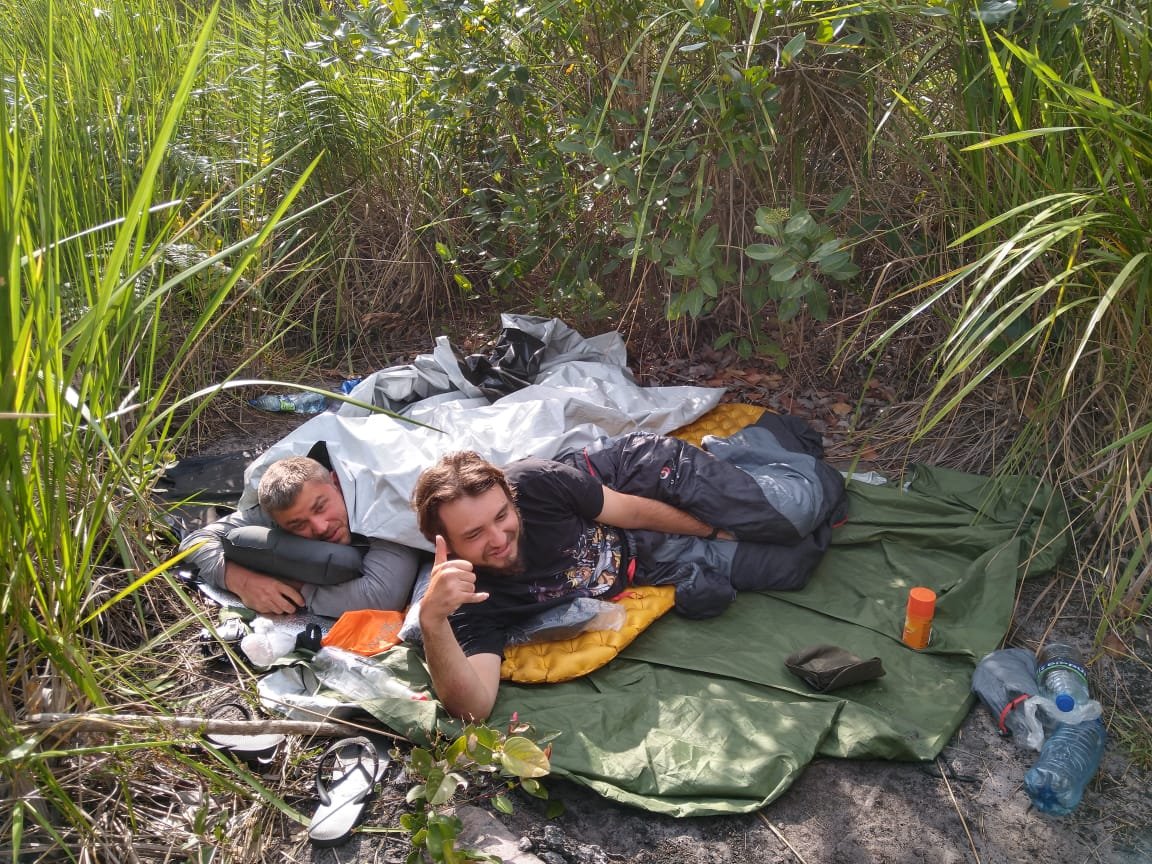 O rio ficava a cerca de 4 metros abaixo do acampamento. Em virtude da seca, o leito estava bem raso e haviam pedras mais lisas para se sentar confortavelmente e preparar as refeições no fogareiro. Thácio e Xandy prepararam uma macarrão ao fungi, temperado com areia (porque Thácio deixou os cogumelos cairem no chão, rs), Eric um risoto de carne, eu e Ernani comemos uma comida liofilizada de macarrão à bolonhesa da marca Mountain (que é muito boa) e Breno comeu milhões de coisas, porque ele não parou de comer 1 minuto sequer. A mochila de Breno devia estar pesando uns 20 kg só de comida. Ele é um poço sem fundo! Eu e Ernani fomos dormir por volta das 19:30, Eric foi logo em seguida e Breno, Xandy e Thácio ficaram resenhando a noite toda. Era cada gargalhada que esses meninos davam… Cada um mais figura do que o outro!
