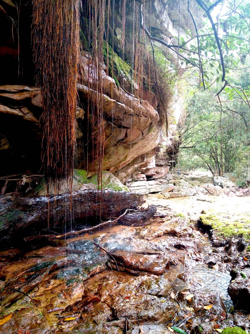 Apesar da época seca, encontramos dois pontos de brotamento de água na encosta de pedra onde pudemos abastecer nossos cantis. Nesses pontos não faltavam musgos e samambaias para embelezar o lugar! Ernani dizia pra gente tomar cuidado que na próxima curva encontraríamos com certeza um dinossauro perdido. Ernani é um brincante, já dizia mestre Peter!