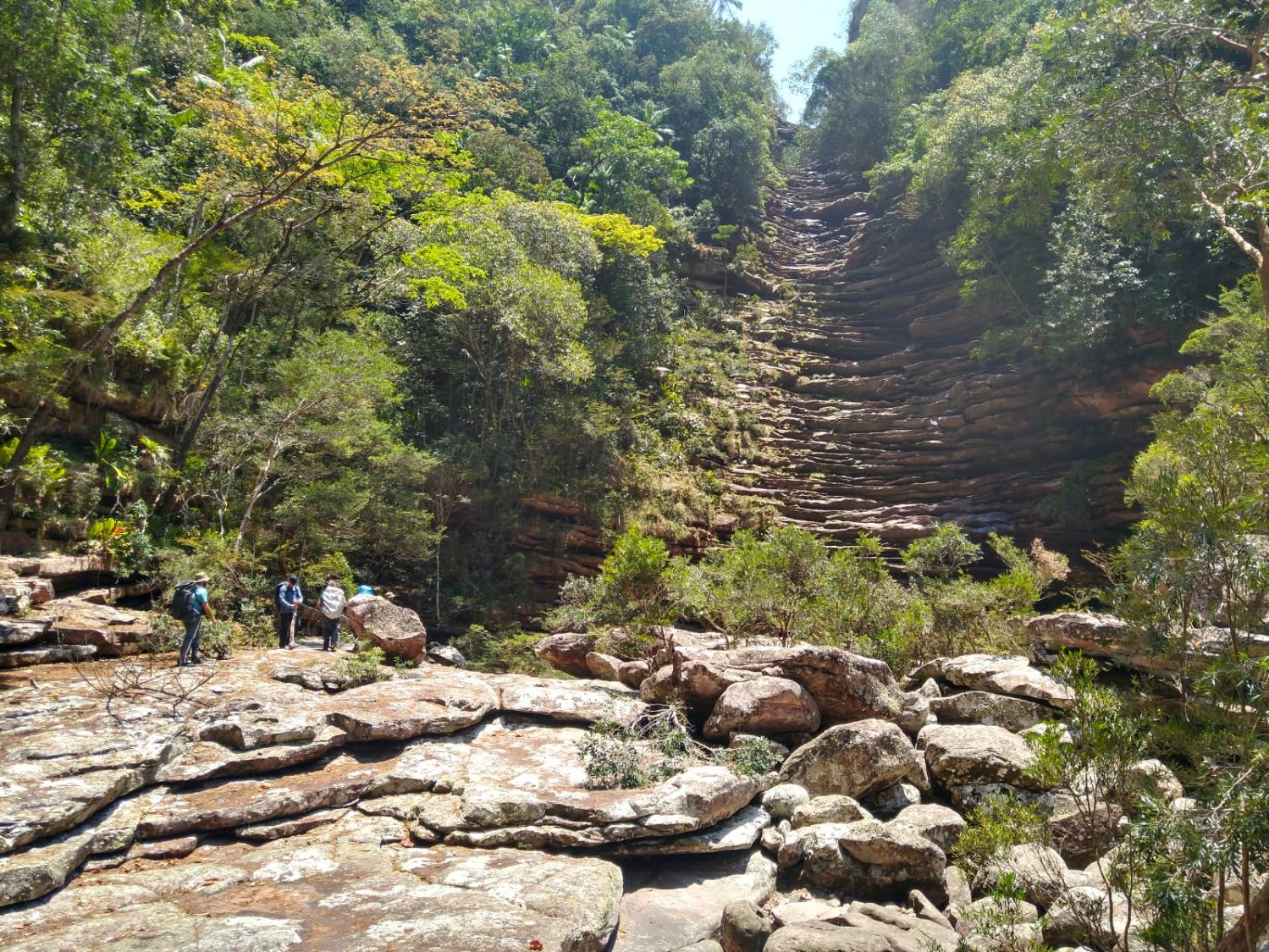 No dia seguinte a gente cometeu o terceiro erro, demorar pra sair do acampamento. Só iniciamos a trilha as 8:40, sendo que ainda tínhamos a defasagem do dia anterior. Seguimos por uma trilha batida que fica um pouquinho escondida pela vegetação, a direita da entrada que segue pelo leito do rio. Andar pelas trilhas da margem ao invés de pular pedra pelo leito adiantava a caminhada e essa foi uma das dicas que Duda nos deu. Ele disse que nós seríamos tentados a andar pelo leito do rio, pois o mesmo estava seco e aparentemente seria a escolha mais fácil, mas Duda chamou atenção de que sempre haveria uma trilha de um dos lados da margem, bastava procurar. No entanto, em algumas partes a trilha da margem estava mais fechada e nós acabamos optando por pular pedra pelo leito do rio mesmo. Vale ressaltar que essa entrada do cânion do Fundão é incrivelmente linda! Tem um trecho que tem uma queda d’água tão alta e tão escondida pela vegetação que não teria fotografia capaz de ilustrar a beleza daquele lugar.