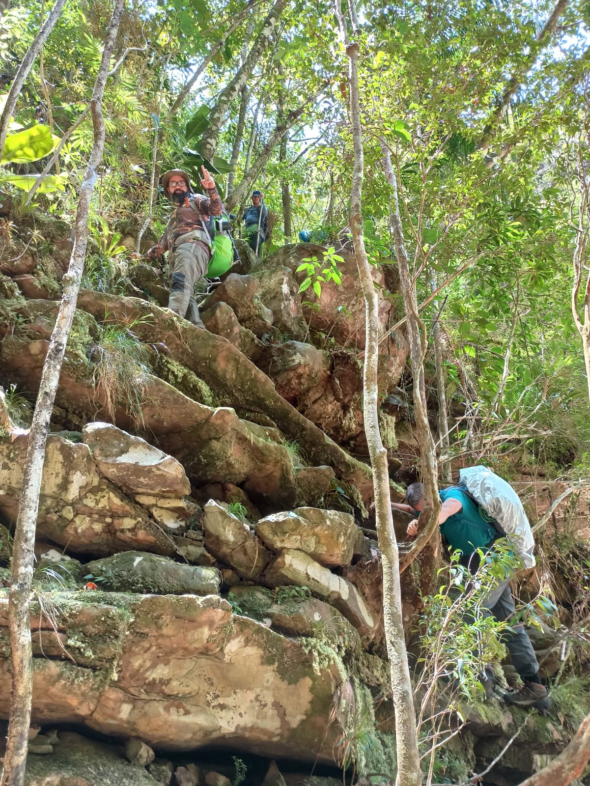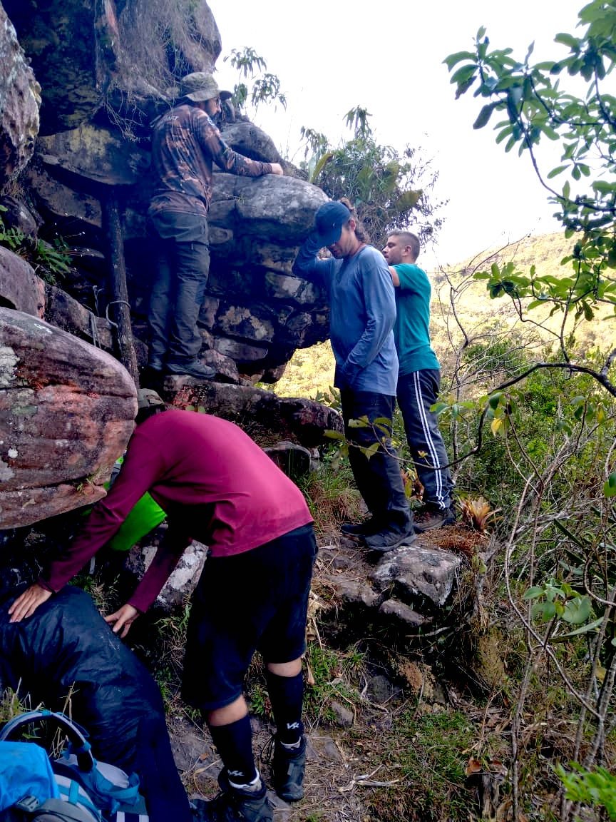Nesse ponto encontramos um casal e um rapaz que também vieram de Lençóis pra acampar no 21. Batemos um papo com eles, trocamos algumas ideias sobre o tracklog e partimos para subida. Essa parte teve momentos de maior exposição do que a subida do Fundão. Tem um trecho em que se faz necessário o uso de corda para subir com mais segurança. Havia antigamente uma corda e uma escada improvisada no local. Porém, ambas estavam completamente inutilizadas. Como Ernani sempre que faz trilha leva uma corda de aproximadamente 15 metros, nós conseguimos superar esse trecho de forma mais segura. Primeiro Ernani subiu com a ajuda de Xandy, Thácio e Breno. Lá em cima ele fez a ancoragem da corda ao redor de uma pedra usando um nó oito e um mosquetão, sem permitir que a corda passe pela parte rente ao chão e sim bordeando a pedra pelo meio. Isso permitiu que Xandy subisse com maior facilidade e usando a corda e outro mosquetão, subimos todas as mochilas. Posteriormente, cada um de nós foi subindo com maior segurança. Inclusive, na parte de cima tem uma pedra menor, onde na sua face traseira, tem uma agarra muito boa para apoiarmos uma das mãos durante a subida. Isso facilita demais a sustentação do corpo.
