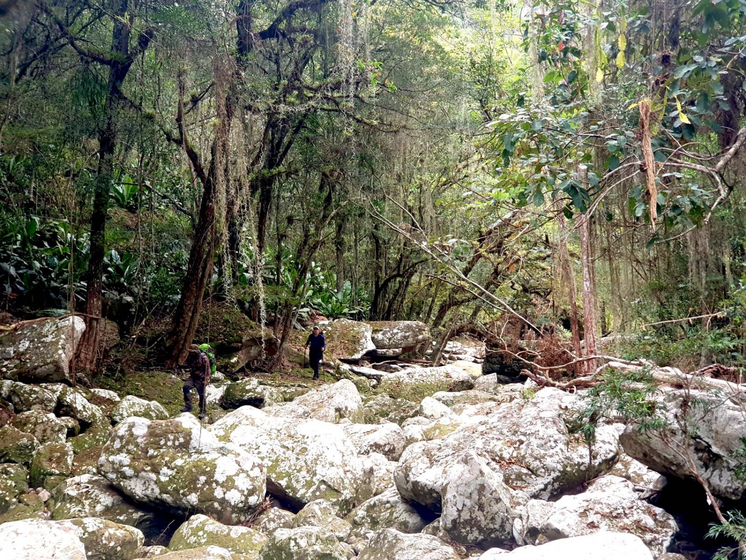 Iniciamos a descida do Grisante em direção ao leito do rio Ribeirão por volta das 13:35. A descida estava com a vegetação muito alta, mal dava pra enxergar a trilha, que estava muito sinuosa. Haviam algumas marcações de setas nas pedras no chão, o que facilitou o processo.