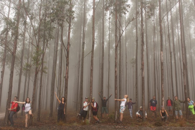 Deixamos o acampamento e seguimos até uma outra plantação de eucaliptos. Tinha tanta, mas tanta, névoa, que tive a sensação de protagonizar um filme de suspense/terror. Achamos, nos eucaliptos, um lugar ótimo pra fotos, e ali ficamos um cadinho...