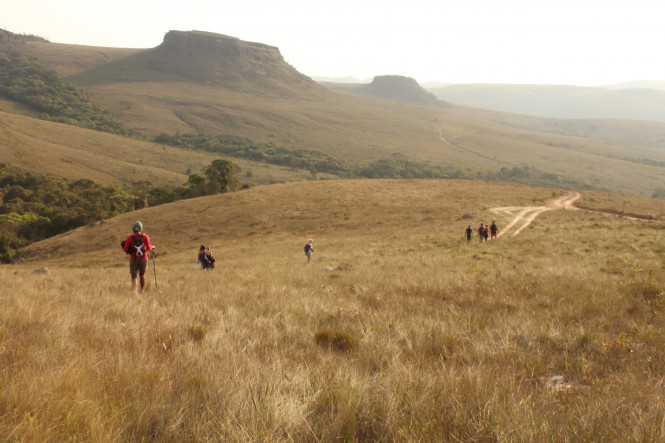 Quando deixávamos a cidade, o tempo começou a limpar e o Sol foi aparecendo. Ficamos mais animados ainda pra andar. Caminhamos mais e mais, sem dificuldades, até um ponto com cerca de 10/15m de escalaminhada leve. Descemos o trecho e seguimos por mais alguns quilômetros até um trecho com um mirante que descortinava um cenário incrível. O guia Naldo não demorou a dizer que ali era o 'Monte Roraima' da novela do Comendador, que estávamos no cenário de gravação.