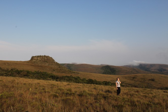 Depois de ficarmos um pouquinho lá, começamos a caminhada rumo ao acampamento. Passamos uma área com vegetação baixa, cenário pra ficar de queixo caído.
