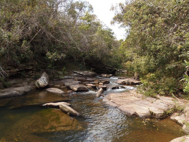 Começamos a andar em direção ao acampamento base. Seguimos um trecho plano, com subidas leves por um bom tempo. (Foi uma grande falha não marcar os horários, mas enfim...) A caminhada em si não teve dificuldades, os trechos eram tranquilos pra andar, sem escalaminhada nem nada. O problema foi o peso, levei muita água e comida.Acho que andamos por cerca de 1h30, 2h até chegarmos ao Poço Quadrado. Deixamos as cargueiras no meio da trilha e seguimos no meio do mato por uns 100m até chegar no Poço. Estava quente, então aquilo ali era um oásis. Imagine uma piscininha, com quedinhas brandas e agradáveis... E aí, um pouco mais adiante, uma outra queda que dava num buracão, ponto perfeito pros doidos que quiseram pular ali.