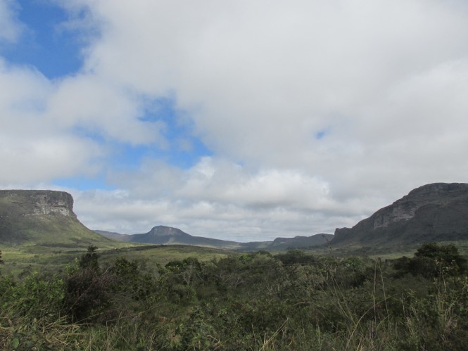 Nossa primeira parada foi em qualquer lugar no meio da estrada. Ali, ficamos embasbacados com a imponência da paisagem. O cenário descortinava as chapadas, montanhas que tem a parte alta retinha, e um céu absurdo.
