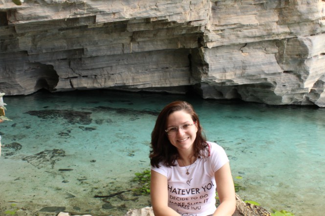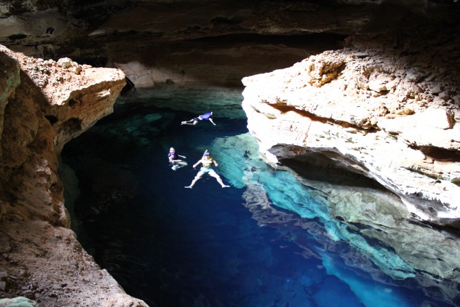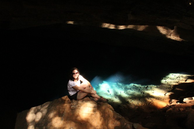 No Poço Azul pagamos a entrada e fomos colocar as roupas de banho. Seguimos uma trilha rapidinha até lá. Foi o lugar mais incrível que já vi. O feixe de luz estava fraco, porém era suficiente para iluminar a caverna inundada por águas cristalinas, de um azul pra glorificar de pé. Para nossa surpresa, só estávamos nós na gruta! Então, o guia tirou várias fotos nossas lá. Parecíamos criancinhas desbravadoras! Foi muito bom mesmo!