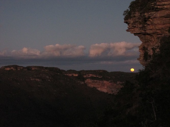 Quando estávamos descendo, a grande surpresa: era noite da Lua Azul, e nos deparamos com aquela esfera gigantesca e alaranjada, anunciando que a noite tinha chegado. Foi incrível demais.