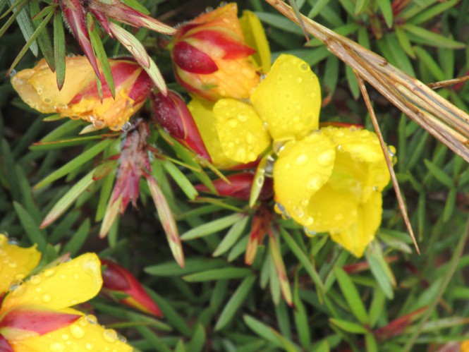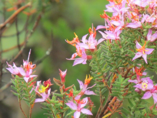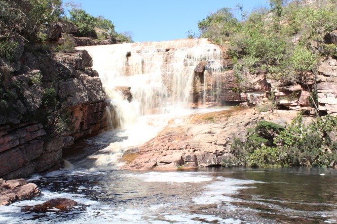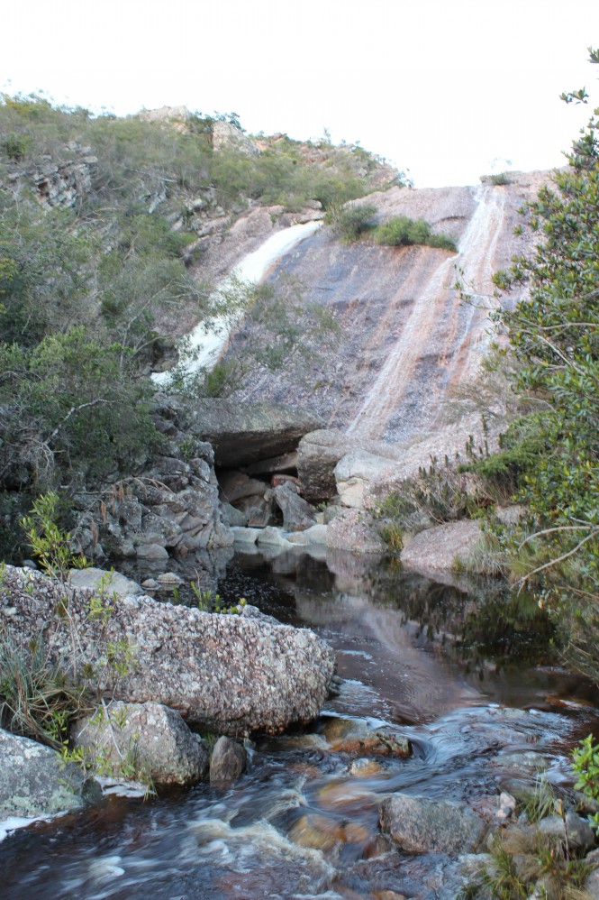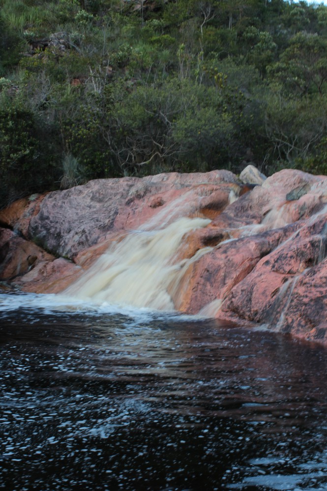 A trilha é uma das mais lindas que já fiz. Flores pra todos os lados, de todos os tons. Imagino que se o tempo estivesse ensolarado eu demoraria muito mais, pois ia ficar embasbacada com o colorido do lugar e ia querer fotografar tudo! Porém, a primeira meia hora é um inferno. Subida é em pedras escorregadias secas, imagine como ficaram molhadas! Porém, depois desse ponto, é passeio no parque. Andamos por mais 1h30min no planalto, em trilha plana, até chegar no rio de águas vermelhas que gera a imponente cachoeira. Atravessado o rio, não leva mais que 5 minutos até o mirante.