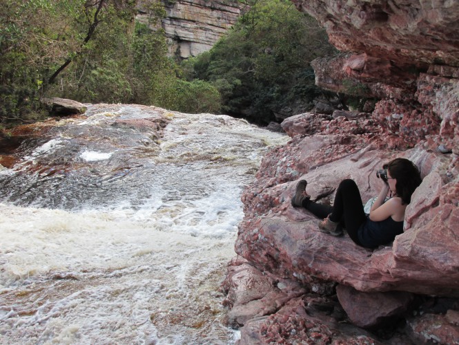 Escolhemos ir na parte alta primeiro, onde tem uma piscina. Ficamos ali um tempinho. Zé entrou na água, Barbieiri deitou num cantinho e eu fui explorar. Encontrei um caminho, e subindo subindo subindo cheguei na parte mais alta da cachu, onde fiquei contemplando por um tempinho.