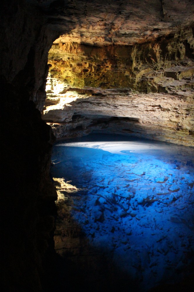 Chegando lá, pagamos o valor da visita e o guia nos deu capacete com lanterna. Então, descemos umas escadas até a entrada da caverna. Andamos lá por 5 minutos até que, na minha esquerda, surgiu uma claridade azulada. Virei o rosto e fiquei totalmente besta com o que vi.
