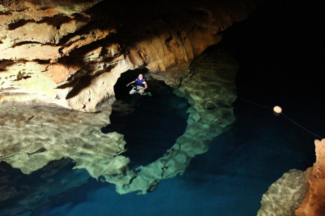 Lá dentro, fomos até um patamar onde o guia pediu que desligássemos as lanternas e contou um pouco sobre a descoberta do Poço, e sua formação. Depois, liberou para fotos. Realmente o nome faz jus ao lugar, era Encantado mesmo.