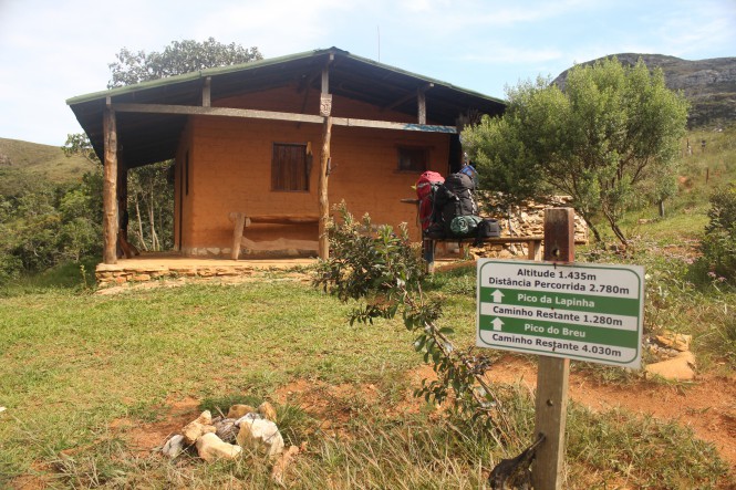 Levamos a tal 1h que o moço falou até o Abrigo Lapinha, que é uma casinha que fica logo depois que começamos a contornar o pico da Lapinha. Ali tem uma torneira com água potável e fresca, além de ter banheiro limpinho. Paramos uns 15 minutos pra descansar um pouco, tirar fotos e repor nossa água.