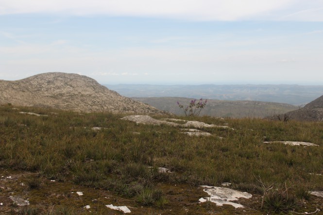 A partir do Lapinha, o caminho é bem tranquilo. Vamos seguindo por um planalto de mato baixo, sem sombra ou árvores, porém bastante florido. Lindo mesmo. Fomos todo o tempo seguindo umas plaquinhas meio azuis e de vez em quando olhávamos o track só pra confirmar que era o caminho certo. Andamos por mais uns 40/50min até que demos de cara com o imponente pico do Breu. Nesse ponto, a trilha se dividia: um caminho indicava o cume do Breu, o outro contornava o Breu.