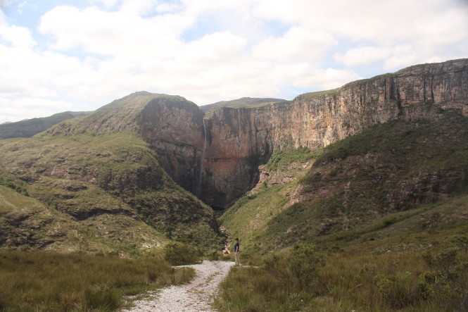 Seguimos um caminho que se inicia à direita depois do córrego que passa pelas terras do seu Zé. Fomos caminhando por uma trilha bem marcada até chegarmos numa descida. Dali era possível ver todo o caminho até a cachoeira do Tabuleiro. Durante todo o percurso de descida a vista é incrível. Esse caminho da casa de Sr.Zé até a parte alta tem cerca de 5km, e o fizemos em torno de 1h.