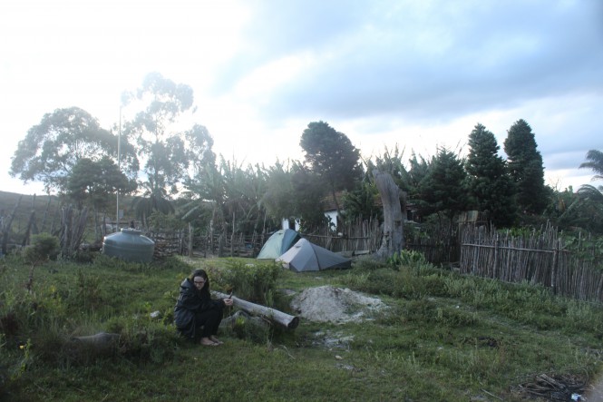 Escrito na porteira tinha um aviso do sr.Lucas, sobrinho de Ana Benta, dizendo que se a casa estivesse só, era só entrar, que ele voltava de noite. Mas, pra nossa sorte, assim que batemos palma o sr.Lucas nos recebeu junto a dois cachorrinhos. Pudemos, pagando R$5,00 cada, tomar um bom banho quente. E, por mais R$20,00 acampar no quintal. Éramos só nós na casa da falecida guardiã da Serra.