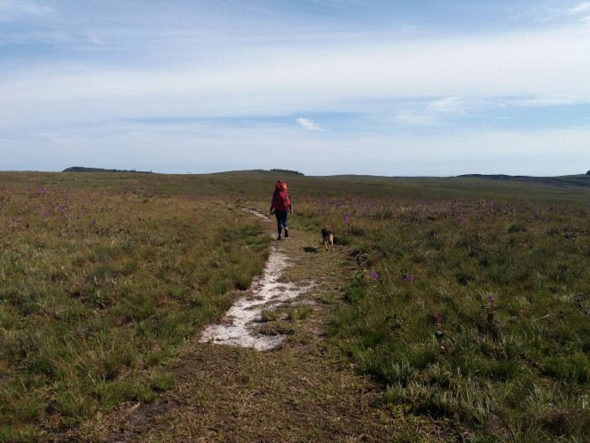 No dia seguinte, quando acordamos, ele tinha feito café pra nós. Deixou duas xícaras na mesinha, e nos explicou como faríamos para ir até a casa da Dona Maria, disse que levaríamos em torno de 3h até lá, num caminho plano em sua maioria. E, nos presenteou com um cachorrinho para ajudar na guiada e fazer companhia. É muito comum ter cachorrinhos acompanhando nessa travessia, mas alguns acabam ficando nas casas de parada, então, por isso, ele nos 'deu' um. Fiquei tão, mas tão feliz, que nem liguei de ficar toda carimbada de patinhas enlameadas. Logo demos o nome de Stuart pro cachorrinho, que nos acompanhou durante todo o percurso até a casa da Dona Maria.