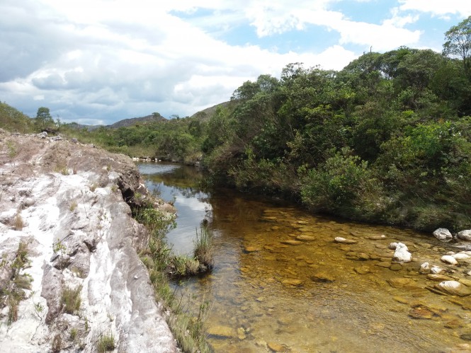 Ficamos sentado na pedra mais um tempo até que começamos a sentir uns pingos de chuva. Como estávamos perto do Rio Parauninha, corremos pra atravessar antes da chuva. Mas, da mesma forma que os pingos vieram, se foram. Então, a gente se animou e aproveitou o calor pra se banhar ali no riozinho e comer.