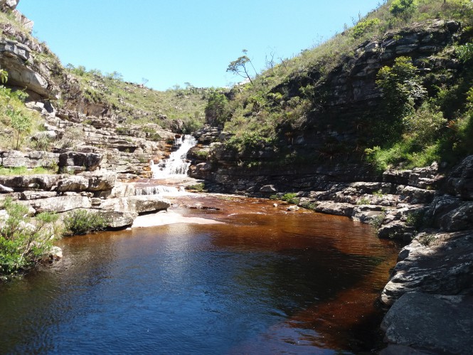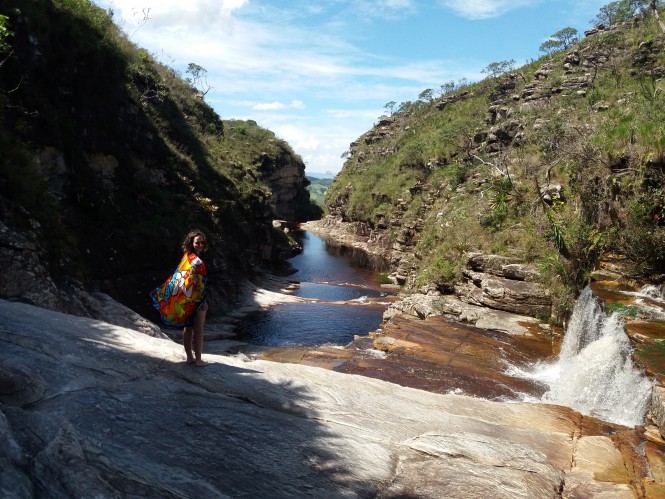 Mais 800m a partir desse ponto e finalmente chegamos na portaria do parque. Lá pagamos R$10,00 cada, assistimos um vídeo informativo e já seguimos por mais 2km de trilha bem ruim até a base da cachoeira. O começo é de areia, só descida, e bem escorregadio. Depois, vamos pelas pedras até o poção. Julguei o trecho curto e grosso.