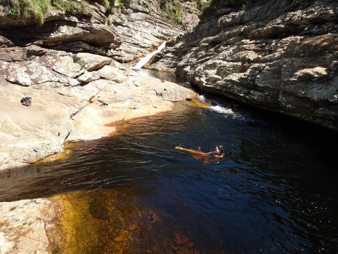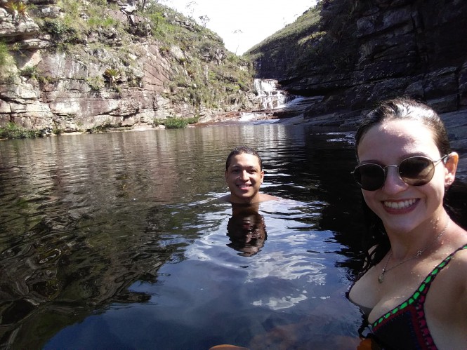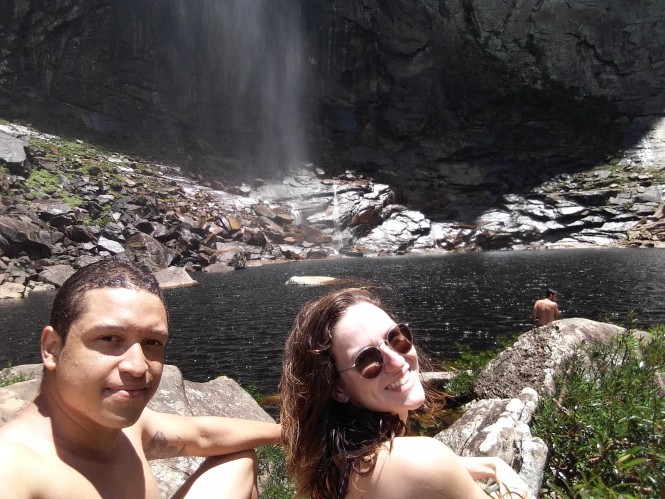 Quando chegamos nas piscinas da cachu a vontade de tomar um banho era enorme, tendo em vista o Sol de rachar que estava na nossa cabeça durante todo o tempo que andamos. E assim fizemos, logo fomos entrando na água. Ficamos um tempinho até lembrar do conselho do Sr. Zé... Ele nos disse pra irmos direto para a queda principal e só depois irmos subindo para as demais piscinas. Então fomos descendo pela cachoeira até essa queda... Apenas nós dois e nosso companheirinho.
