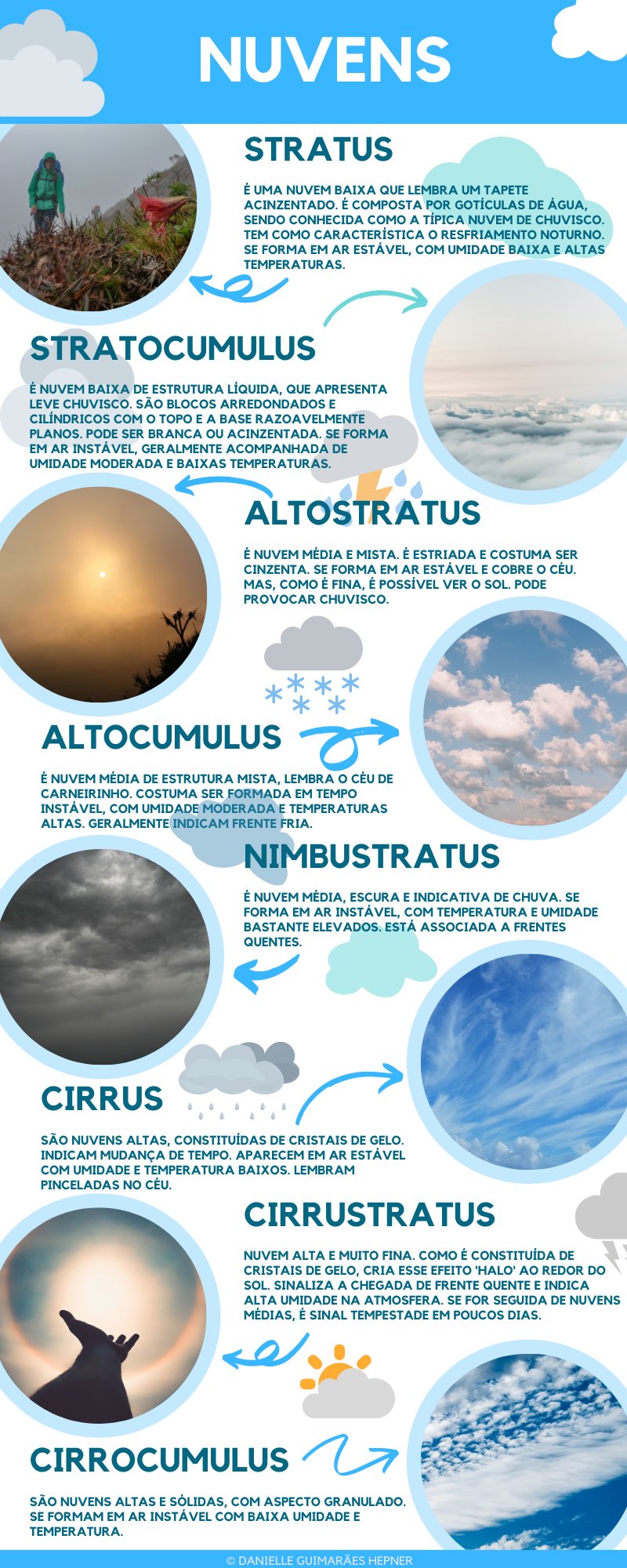Voltando às nuvens, elas são classificadas de acordo com seu aspecto básico, estrutura e estágio de formação.