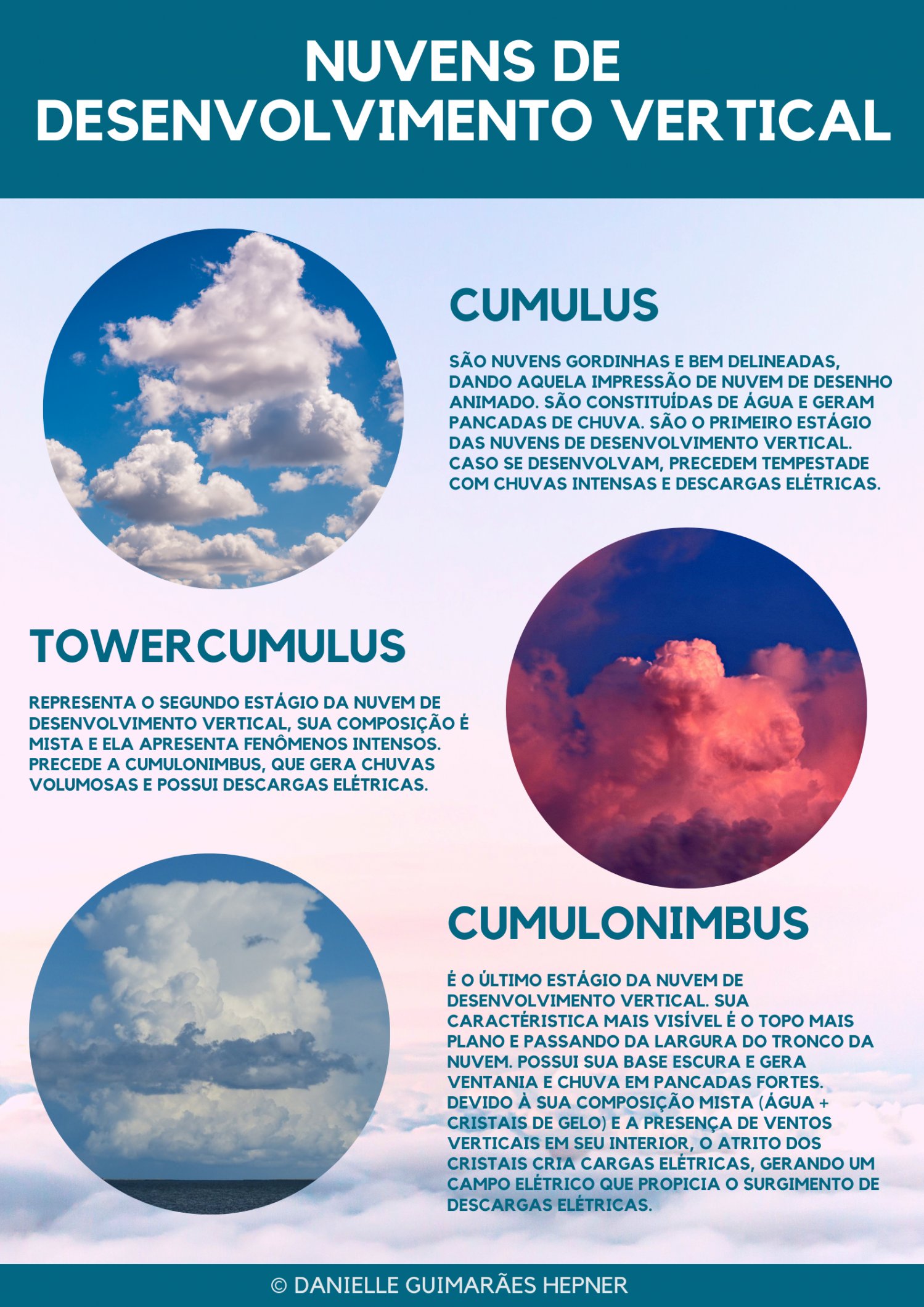 Além de todos os tipos que já foram citados, há também as nuvens de desenvolvimento vertical. Como o nome já diz, se trata de nuvens que inicialmente são pequenas e sem muita altura, mas que se transformam ganhando altitude e podendo atingir até 15km. Para os praticantes de esportes outdoor, estas representam nuvens muito perigosas pois mudam rapidamente de estágio, levando à formação de tempestades com chuva bastante volumosa e intensa, além da presença de descargas elétricas.