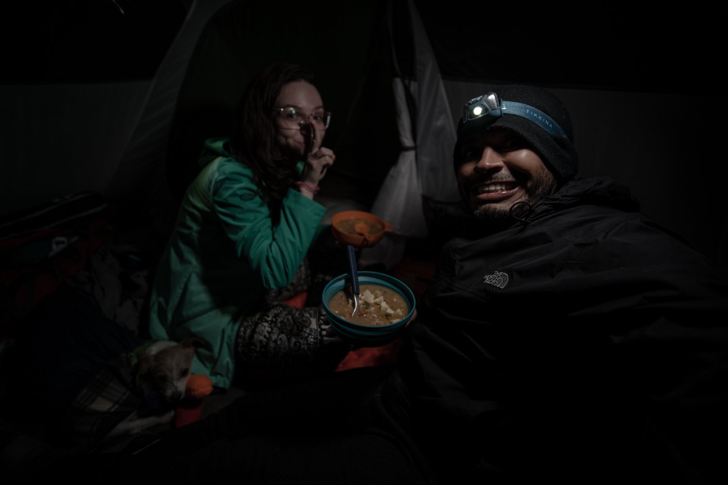 Montamos a barraca no meio de uma ventania gelada e muita risada. A previsão do tempo ia ser chuva só no fim do dia seguinte, então a gente se encheu de esperança pra ver o pôr do Sol. Acabou que o tempo fechou de tal forma que não enxergamos um palmo a frente do nariz, e passamos o tempo todo na barraca comendo a beça, batendo papo e ouvindo podcast (essa último é mentira, eu apaguei; mas juro de pé junto que tava acordadíssima escutando).