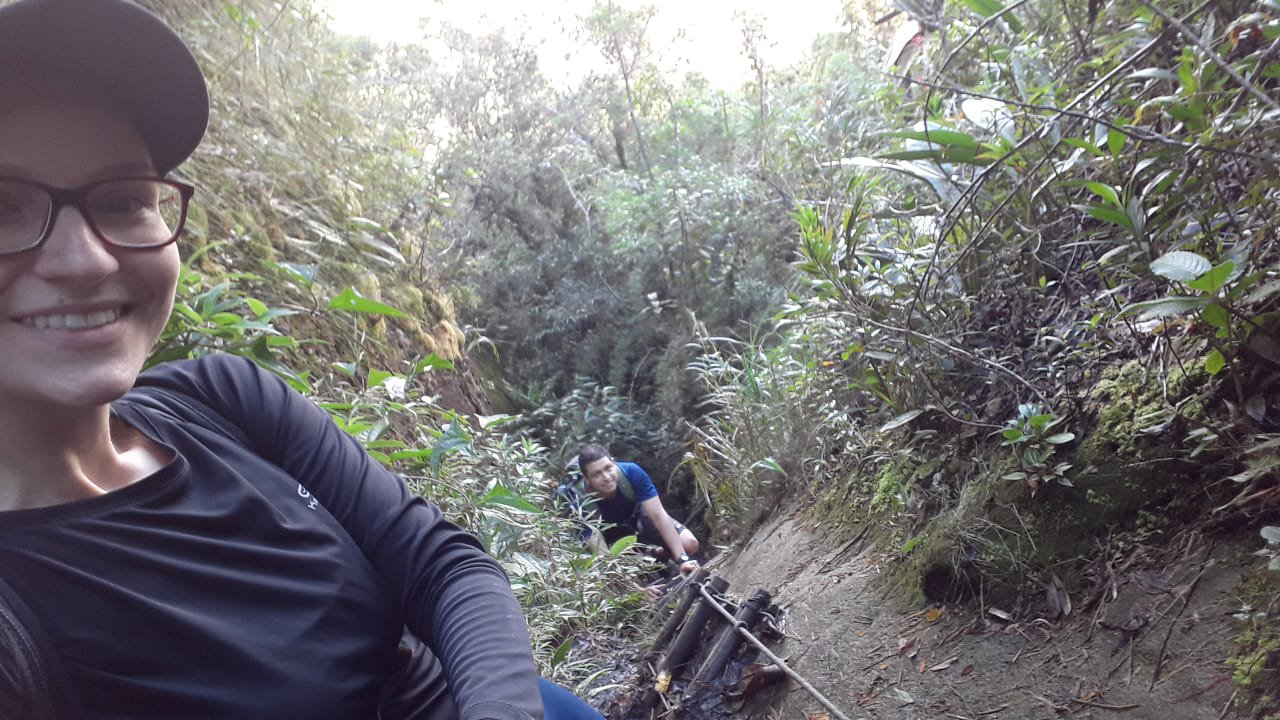 Daí, assim que vira um caminho mais aberto, porém ainda dentro de mata bem fechada, passamos por uma pequena cachoeira onde é possível se refrescar, mas não é confiável para beber. Vale dizer que esse é o único ponto com água no caminho todo.