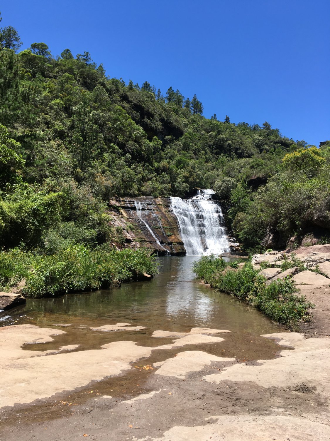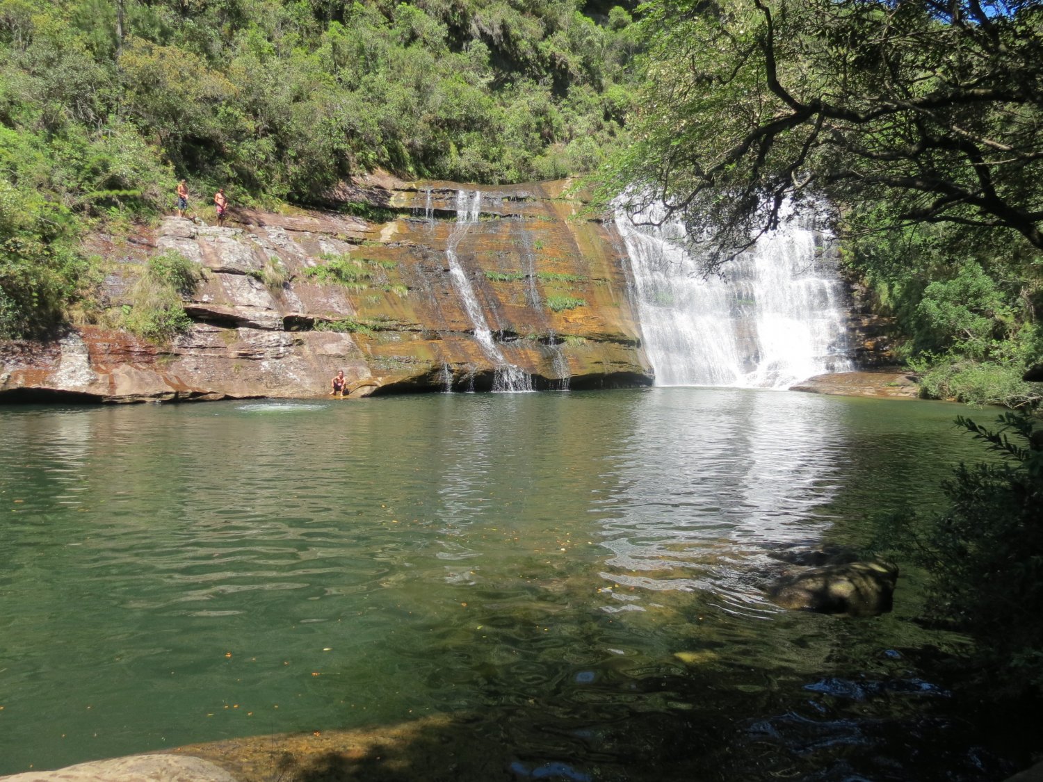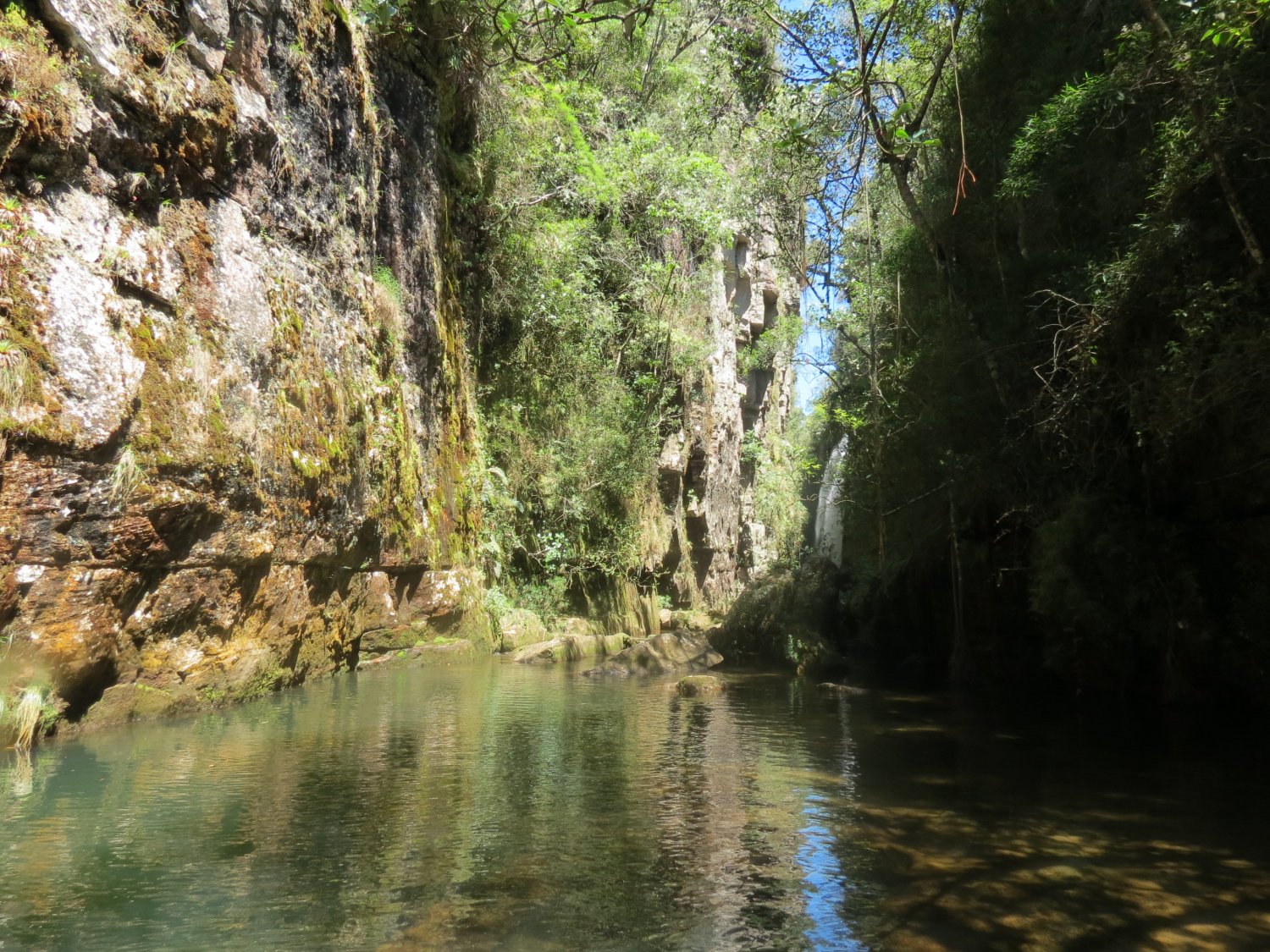 Passado o friozinho na barriga, é só seguir o caminho pelas beiradas e ver o maravilhoso cânion de Jaguariaíva e a cachoeira ao fundo. Com águas bem transparentes, dava para ver alguns peixes nadando. As pedras dentro do rio são bem escorregadias e exigem muita atenção pra não capotar e se machucar. Segundo pesquisadores, esse lugar um dia foi mar, por isso você encontrará areia ali, igual as que tem no mar.