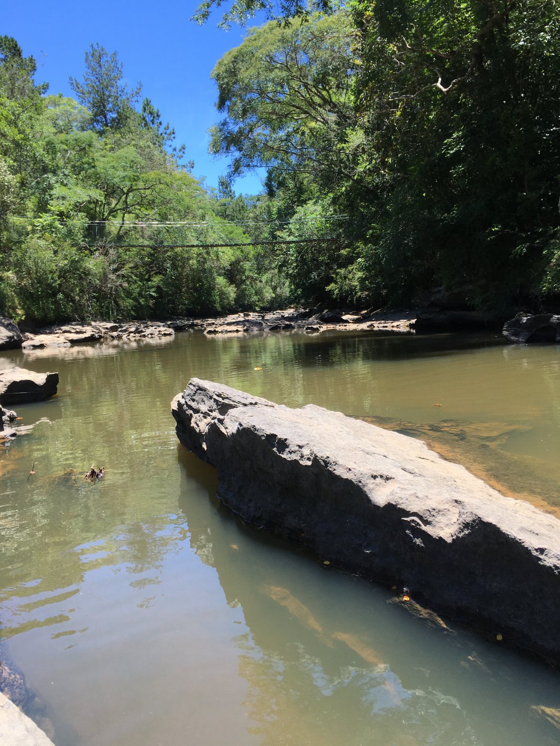 Logo que entramos atravessamos o rio por meio de uma pequena ponte que balança muito kk e de cara já vemos a primeira cachoeira que é onde o pessoal fica mais pra relaxar, algo mais família.