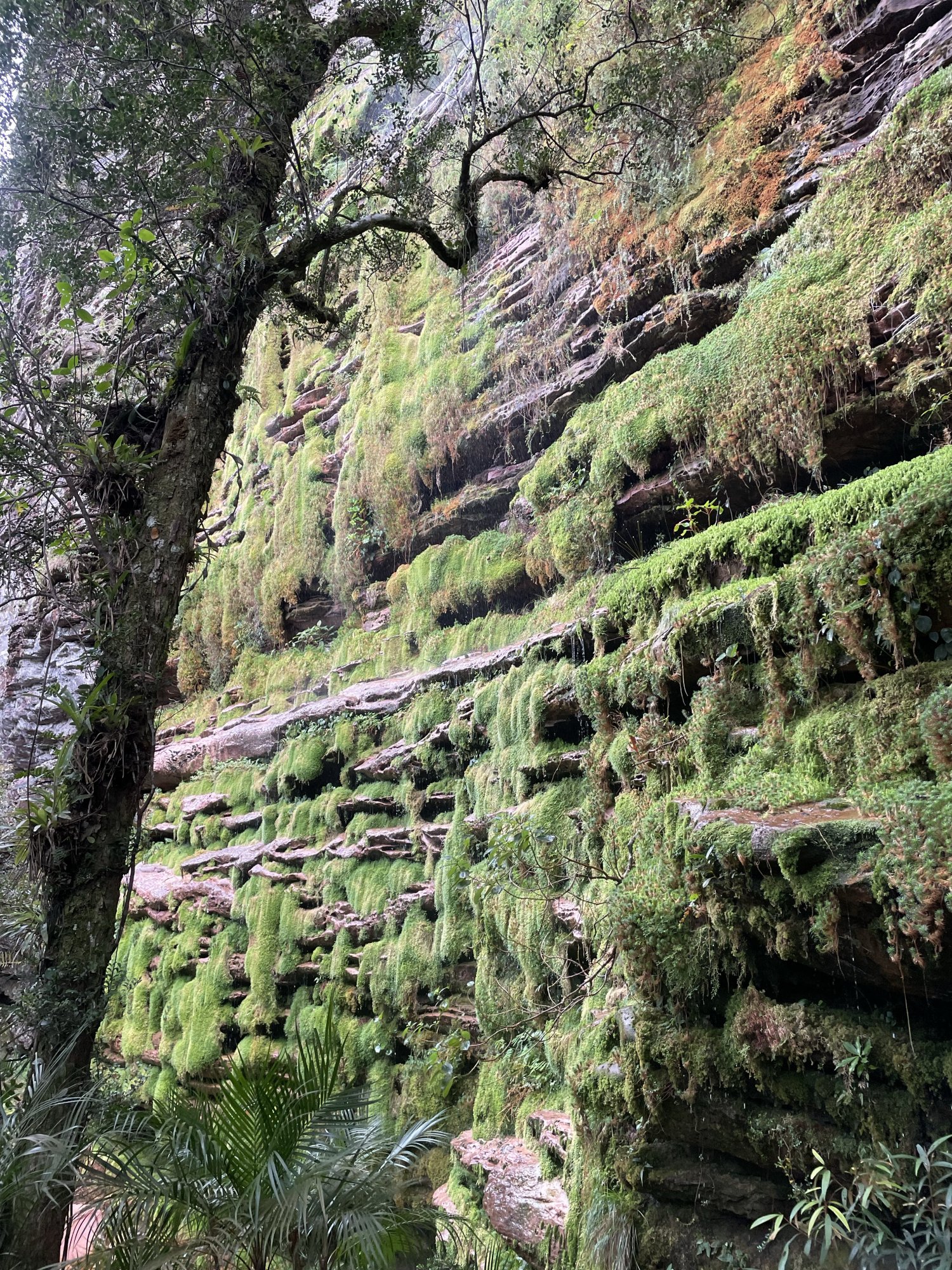 Paredão coberto de musgos, à direita de quem desce a cachoeira do XXI.