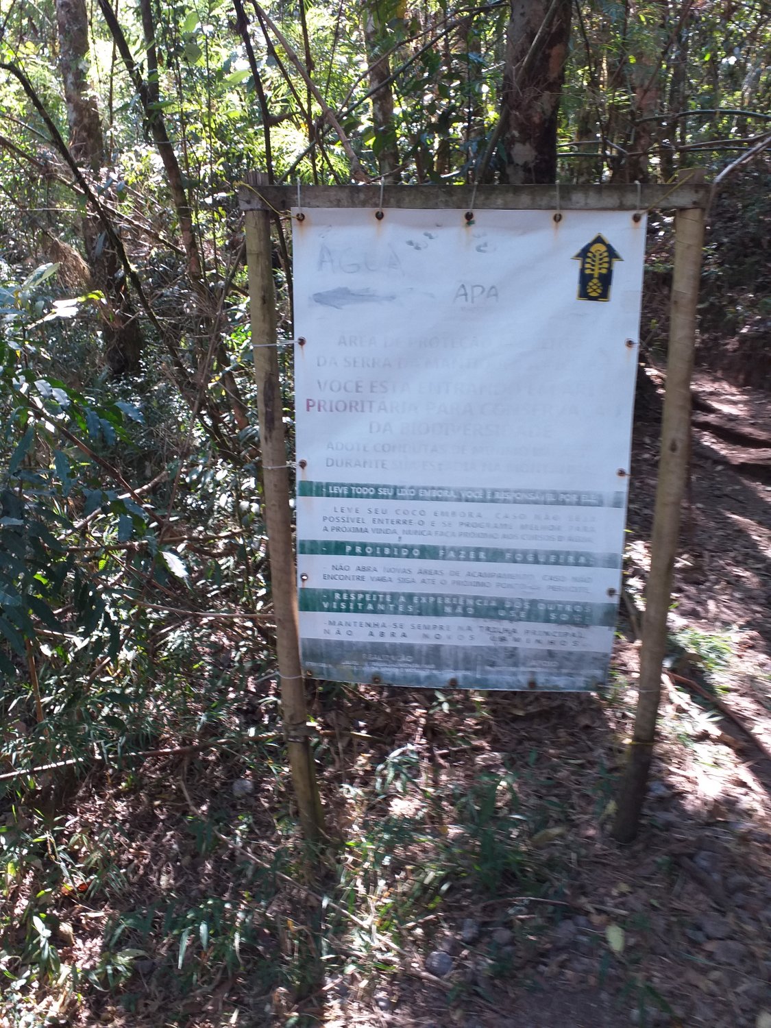 Antes da placa indicando que estamos entrando em uma APA (Área de Proteção Ambiental), fizemos um pequeno desvio do percurso para pegar a água que deveria durar o primeiro e metade do segundo dia. Eu peguei 5 litros, porque sabia que isso seria o suficiente. A água no Marins, onde nós iríamos acampar neste primeiro dia está parada e tem a possibilidade de estar contaminada, sendo assim, não contamos com ela e preferimos encher os nossos cantis antes da subida mesmo. Isso torna a ascensão mais complicada pelo peso, mas é melhor estar pesado do que passando mal por ter bebido água contaminada.