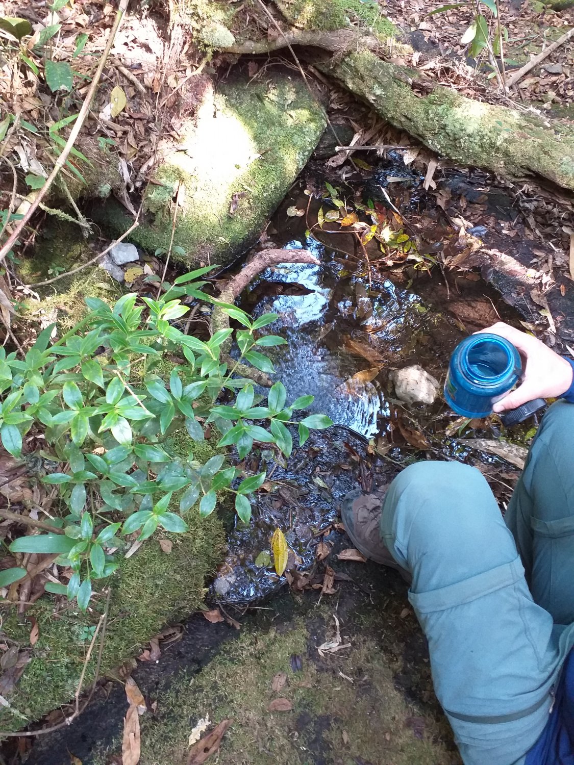 Nesse trecho do caminho entre a Pedra Redonda e o Itaguaré há um local para pegar água, é bem escondido, porém alguém deixou uma indicação no chão mostrando o local da bifurcação onde se encontra a água. No nosso caso estávamos seguindo um tracklog, então já sabíamos deste local. Nos abastecemos o suficiente para até o final da travessia. Importante lembrar que mesmo que pareça limpa, tanto no ponto de água do primeiro dia quanto nesse dia nós utilizamos clorin ou hidroesteril para purificar a água.