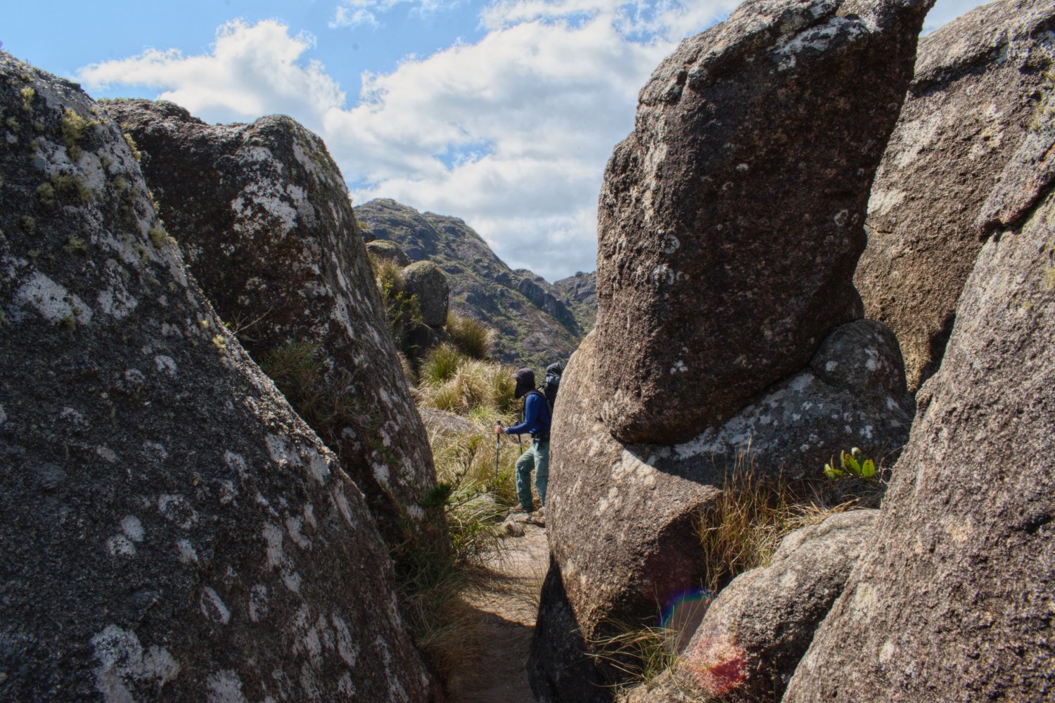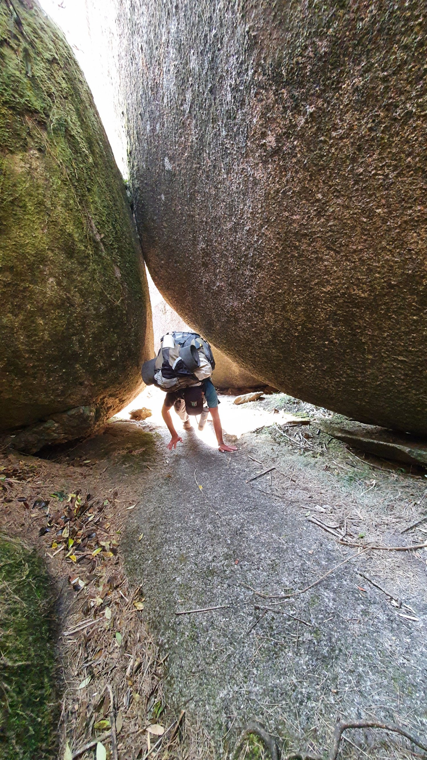 Seguimos o caminho, nesse trecho há algumas partes em que se passa pelo meio de pedras, em algumas passagens tivemos que tirar a mochila.