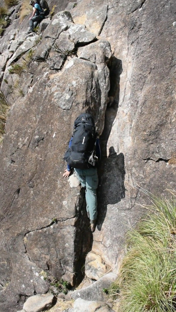 Provavelmente a parte mais complicada deste primeiro dia é uma “escalada” bem curta em uma fenda, de uns 4 metros. Nada muito complexo, mas com cargueira fica mais difícil! Felizmente nos três já temos alguma experiência em escalada, o que deve ter ajudado. Caso não tenha, não se preocupe, é mais simples do que parece.