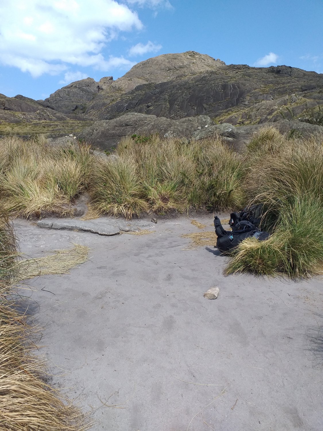 Chegamos as 16h no colo do Itaguaré, onde achamos uma boa área de camping. Montamos o acampamento já percebemos que aquela área ventava bastante e isso poderia ser um problema na hora de cozinhar. Achamos um bom lugar perto das pedras para ser a nossa cozinha.