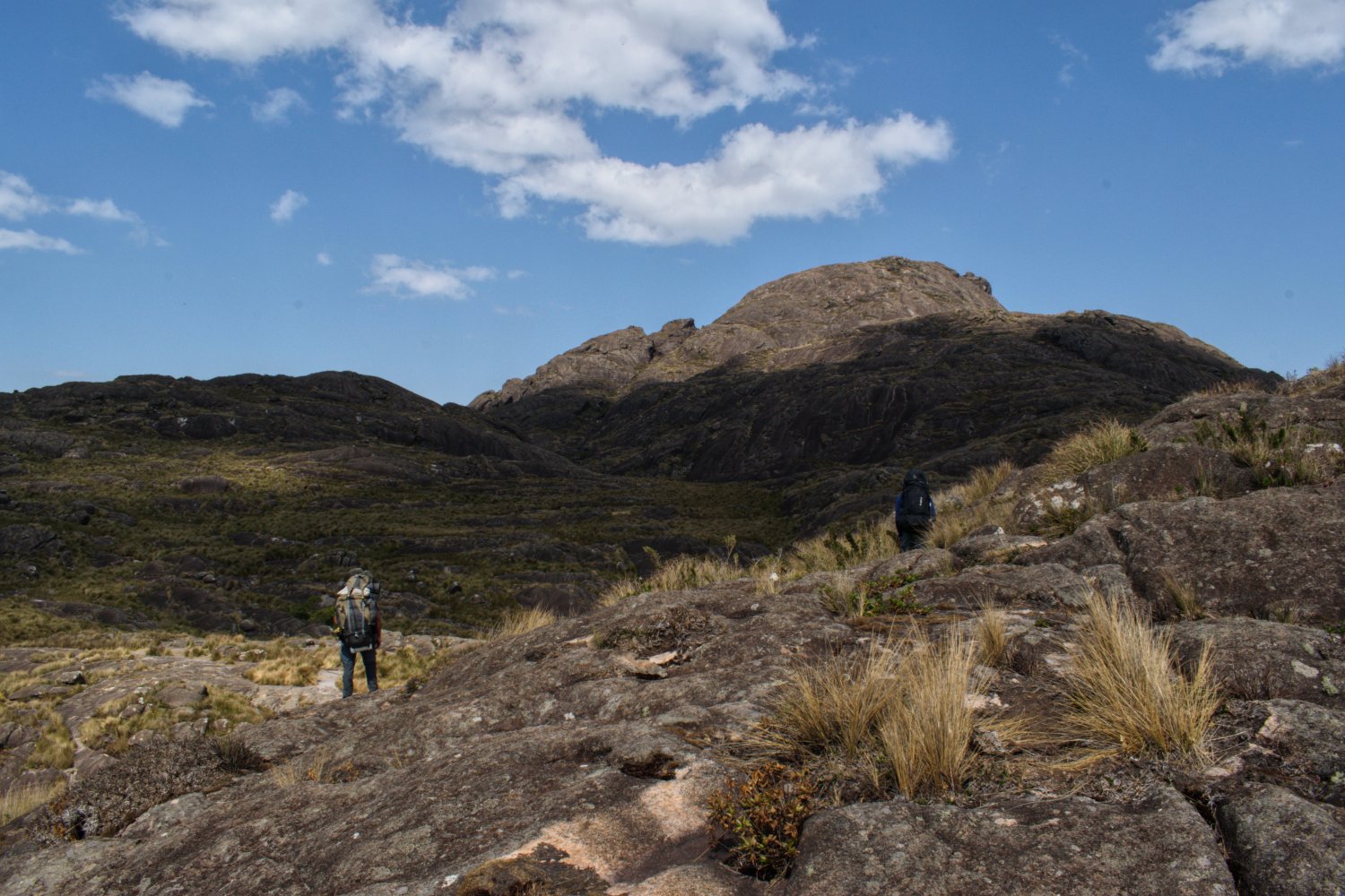 Teoricamente esse segundo dia é o mais pesado, principalmente em perdas e ganhos de elevação. Por isso não enrolamos muito para começar a caminhada. Logo de início subimos rumo ao cume do Marinzinho (2.393 m). A inclinação não era tão forte, subíamos de forma mais gradual que comparado ao primeiro dia. Em certo ponto nos perdemos do caminho que estava marcado no tracklog e estávamos contornando o Marinzinho ao invés de subir de forma mais direcionada. Conseguimos identificar o erro e resolver de forma rápida e com um pouco de esforço para subir uma parte mais inclinada.