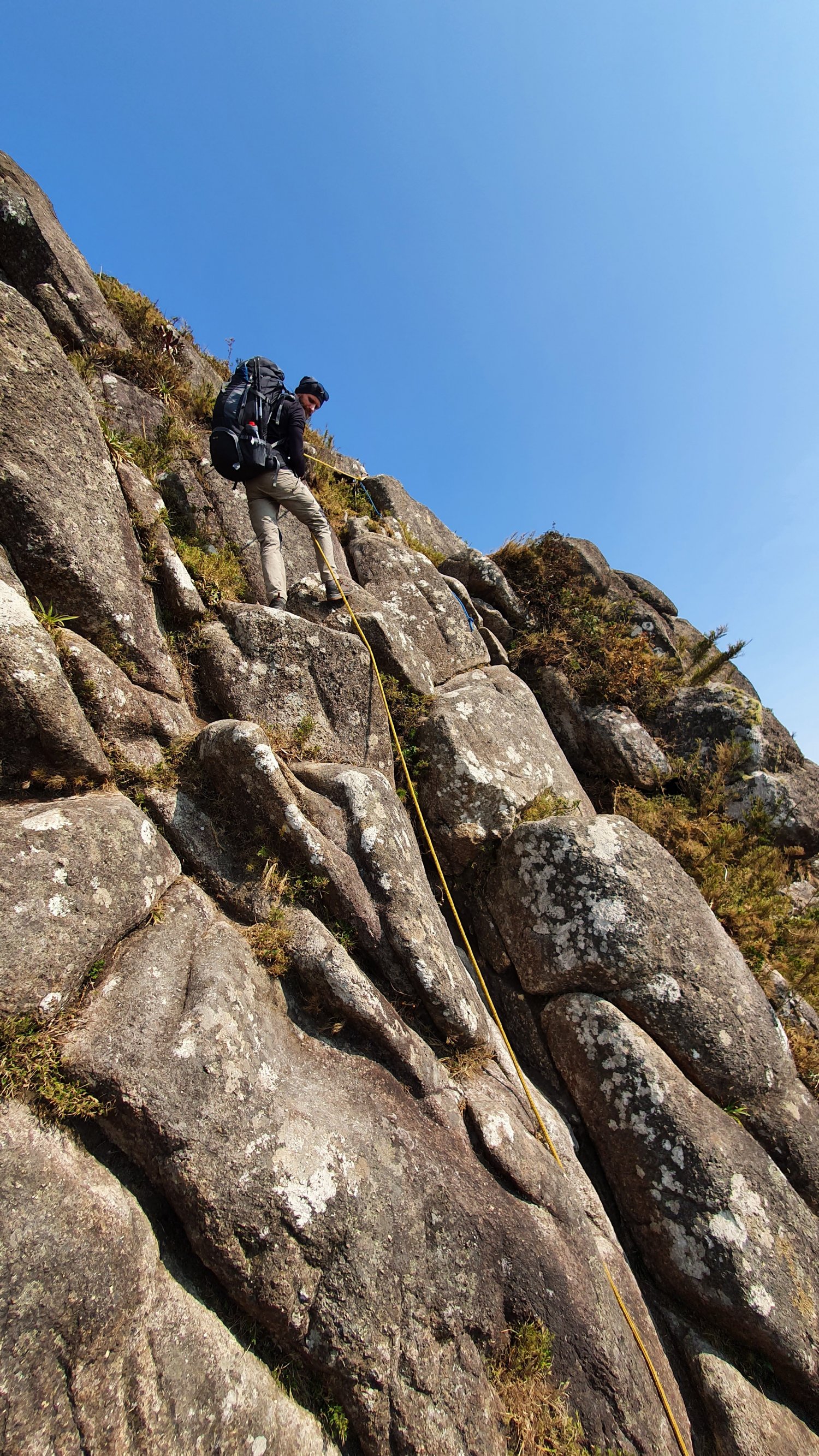 Passamos por um trecho de corda, que já possuía uma corda fixada, mas sempre lembre de conferir a condição dela. Acredito que por ser uma travessia conhecida, muitas empresas de turismo já fazem esse trabalho, mesmo assim é bom dar uma olhada e se possível levar uma corda. O trecho é curto e não exige muito fisicamente, porém como no caso da escalada de fenda, a cargueira atrapalha um pouco.