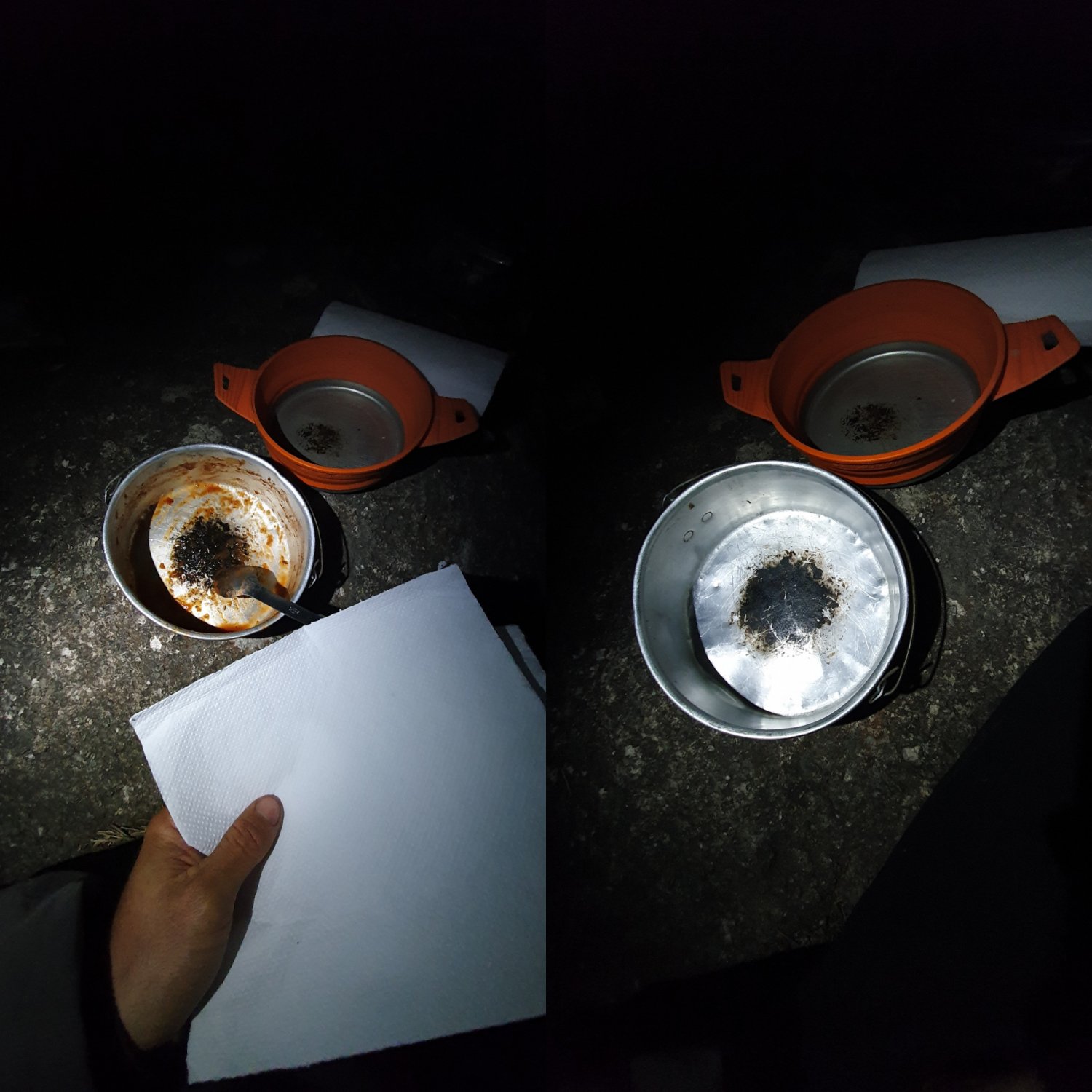 Antes de escurecer iniciamos nossa descida para o local onde o nosso acampamento estava montado. Foi bem rápido, acho que descemos em uns 25 min, no máximo. Já chegamos e começamos a preparar a janta enquanto ainda havia um pouco de luz! Hoje o cardápio foi arroz e frango desfiado, tudo pré-cozido para economizar gás. Depois do jantar aproveitamos para olhar as estrelas! O céu estava muito bonito e foi possível até mesmo fazer um registro da via láctea. Depois de algumas conversas e fotos fomos todos dormir.