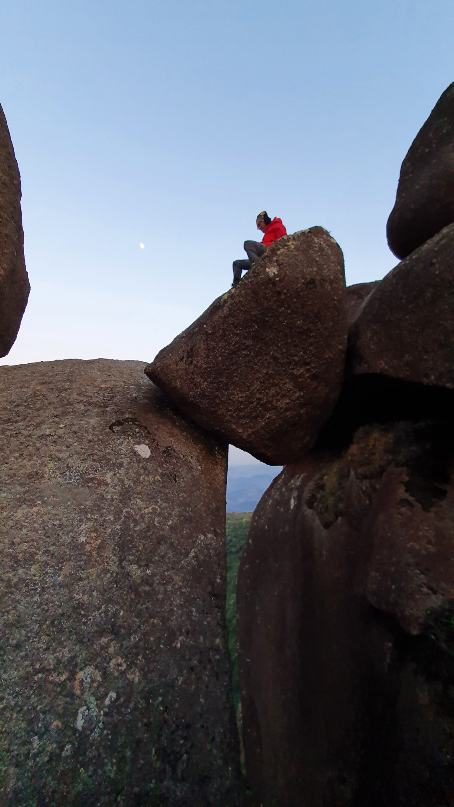 Acordamos às 5h para ir até o cume do Itaguaré e ver o sol nascendo, na minha opinião essa ascensão é onde há mais riscos de queda durante a travessia toda, então tem que estar bem atento(a), principalmente no “pulo do gato” e a escalaminhada para chegar ao cume com o livro. É importante levar ou ir com alguém que tenha equipamentos de segurança nessas partes da ascensão.
