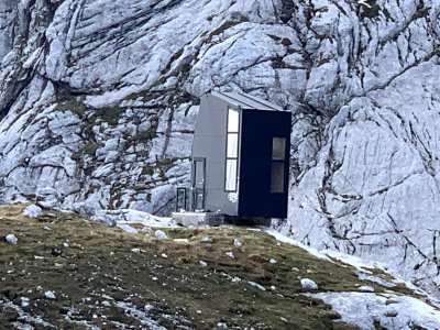 Caminhada numa trilha subindo no cume da montanha chamada Skuta (Eslovênia) passando dois bivaques, Bivak pod Skuto e Bivak Pavla Kemperla.