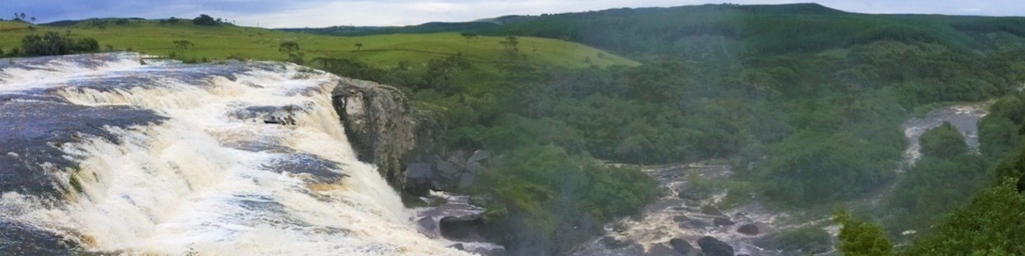 Travessia pelo Rio Tainhas e vista da Cachoeira do Passo do S, no município de Jaquirana, RS