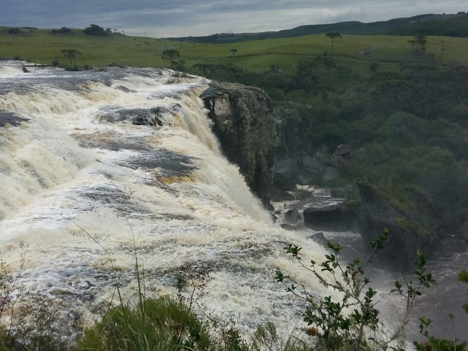 Os guris (sim, sou gaúcha, eu falo guris) desceram por uma trilha para ver se dava para chegar perto da cachoeira. Ficamos esperando, com receio da chuva chegar. Quando eles voltaram, disseram que tinha uma trilha rápida que levava até perto da cachoeira. Então nós descemos. Ficamos impressionados com o volume de água caindo. Dava para sentir as gotículas de água vindo em nossa direção.