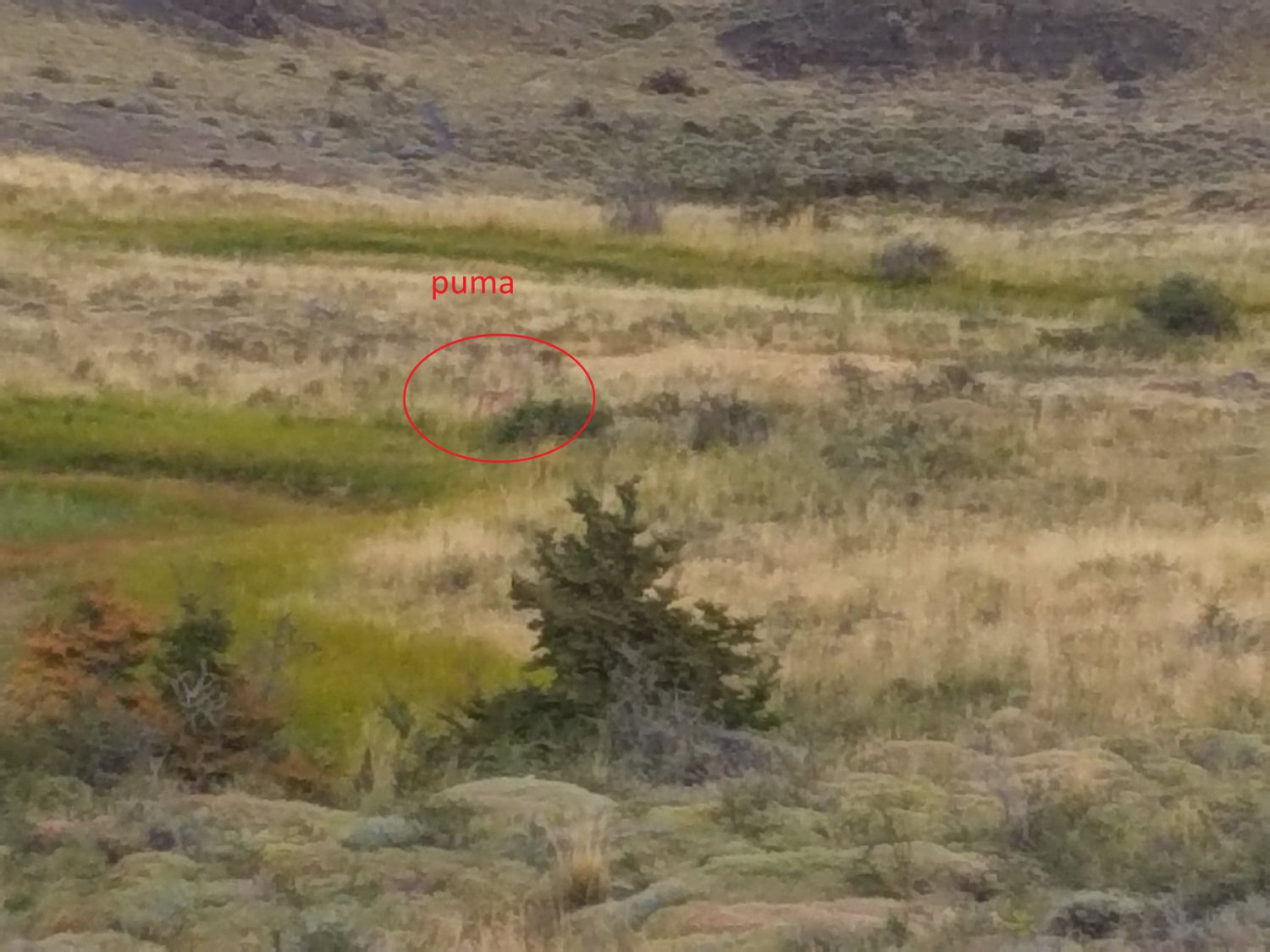 Saímos de Puerto Natales no ônibus das 7h. Chegando na Portaria Laguna Amarga, compramos os ingressos e voltamos para o ônibus para descer em Pudeto. No caminho para Pudeto, o ônibus parou porque o ônibus da frente estava parado. Tinha várias pessoas fora do ônibus olhando para um mesmo lugar e fotografando. Demoramos para ver que tinha um PUMA ali perto, se afastando lentamente. Nem acreditei que consegui ver um puma no primeiro dia! Era algo que eu queria muito! Mas como eu não tinha uma câmera boa a foto ficou ruim com o zoom: